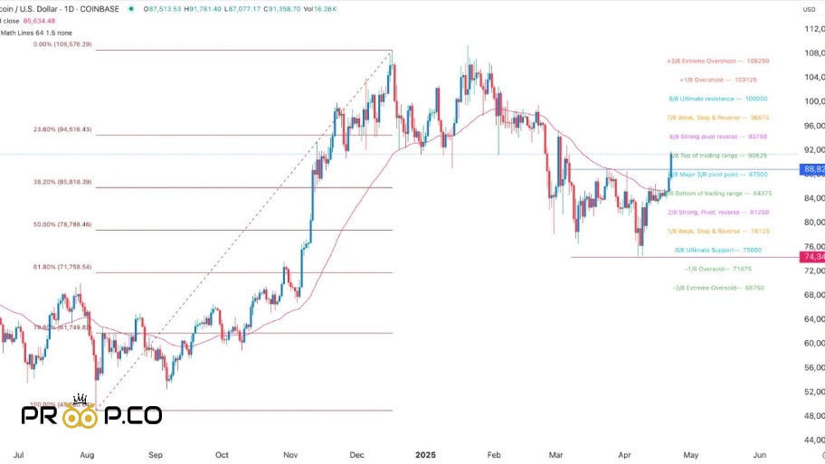رشد پرقدرت BTC/USD از کف ۷۴۳۴۵ دلار در اوایل ماه آغاز شد و تا سقف ۹۱۵۰۰ دلار ادامه یافت. در شرایطی که ریسکهای جهانی افزایش یافتهاند، بسیاری از سرمایهگذاران بهسوی بیتکوین بازگشتهاند و آن را پناهگاهی امن در برابر نوسانات اقتصادی میدانند.
