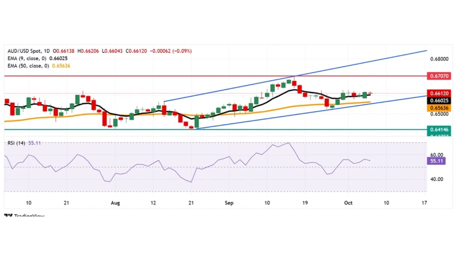 جفتارز دلار استرالیا به دلار آمریکا (AUD/USD) در معاملات روز سهشنبه (۱۵ مهر ۱۴۰۴) در محدودهی ۰٫۶۶۱۰ در حال نوسان است. تحلیل تکنیکال در نمودار روزانه نشان میدهد که این جفتارز درون یک کانال صعودی در حال حرکت است که بیانگر «غلبهی تمایل صعودی» در بازار میباشد. علاوه بر این، شاخص قدرت نسبی ۱۴روزه (RSI) بالاتر از سطح ۵۰ قرار دارد که این دیدگاه صعودی را تقویت میکند.