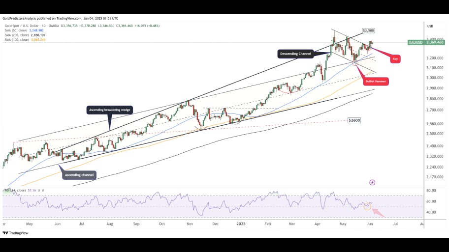 در نمودار روزانه، قیمت طلا در قالب یک الگوی گسترشی صعودی (ascending broadening wedge) در حال حرکت است. شکست سقف کانال نزولی پیشین در دل این ساختار، مسیر را برای حرکت به سمت ناحیه ۳٬۵۰۰ دلاری باز کرده است. همچنین، شاخص قدرت نسبی (RSI) از سطح میانی بازگشته و به ناحیه مثبت ورود کرده که نشانهای از بازگشت مومنتوم صعودی است.
